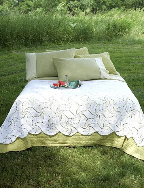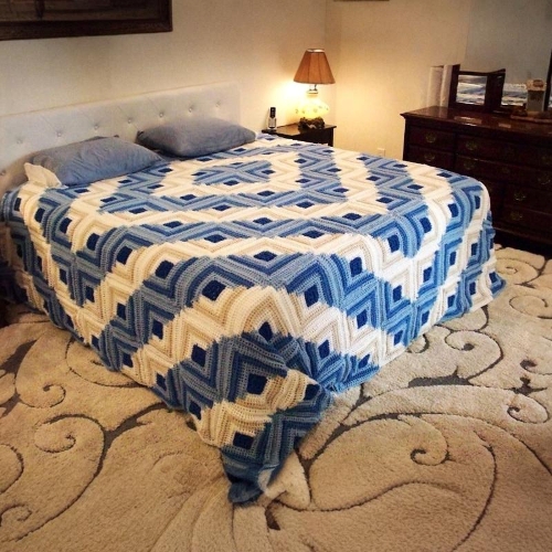 Frances Powell is behind the creation of this tri color bedspread. To make this, you need to engage with intermediate crochet stitches with a gauge of rows 1-5 = ‚½-inch/1.25 cm.