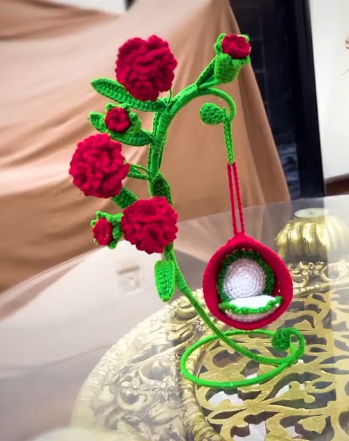 For this one, you have to work on flowers, dolls, and other details using basic crochet stitches. The pattern is shared by TiemBeCon.