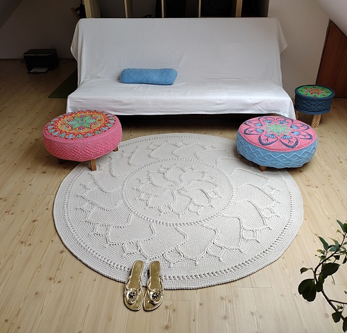 Magic Carpet Studio shares a Lotos mandala rug for your floor decor. It is a round shape featuring overlapping petals.
