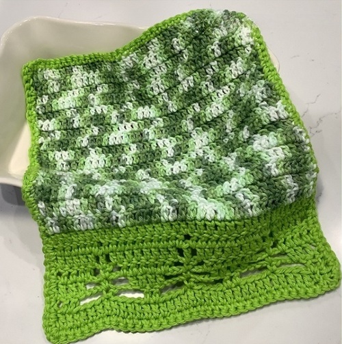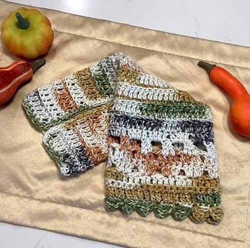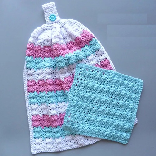 This Darrowby towel set is in farmhouse style, crocheted with contrasting stitches and good color shades. Free pattern is by Rebecca J Miller.