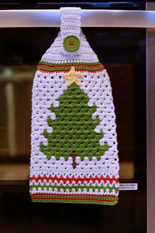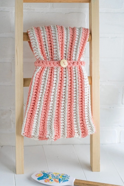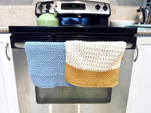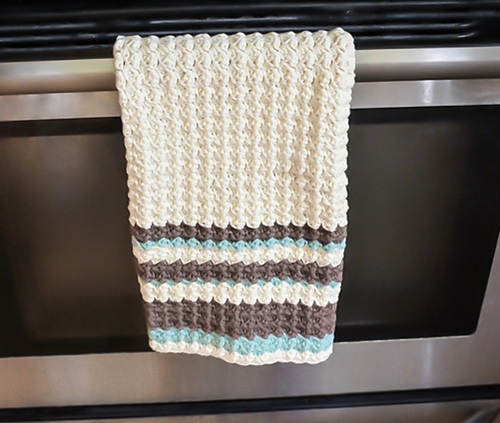 Lindseys cute ribbed tea towel is easy to make. Do check the material list, gauge, tutorial, and sizing information to DIY.
