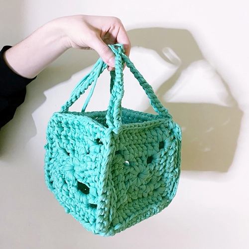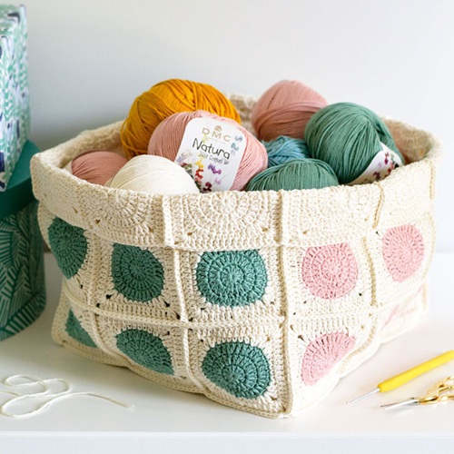 Ilaria Dottys basket is crocheted by joining the square modules with a crochet hook. Each one starts with a circle and turns into a square! You can make them more colorful, too!
