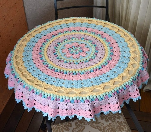 This round crochet tablecloth showcases a beautiful pastel color palette with intricate detailing and a charming scalloped edge. No one will believe that you made this tablecloth at home.