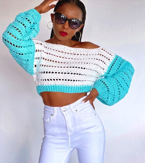 Make this off-shoulder sweater top to slay at different occasions! Its created using cotton yarn by AC Crochet.