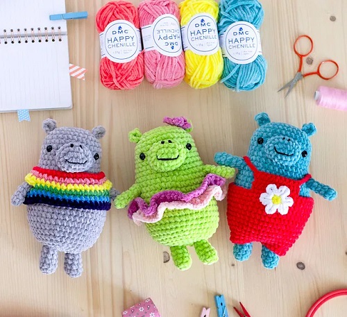 These flower power hippos by Ilaria Caliri (aka airali) feature three different dress styles, namely rainbow sweater, skirt, and dungarees. Check the crocheting way.