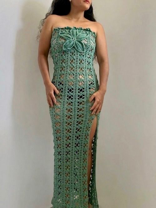 This dress has silts on both legs, making it a bold, daring, and stylish dress to put on any special occasion. It uses basic to intermediate crochet stitches with a simple gauge..