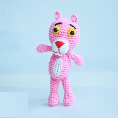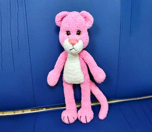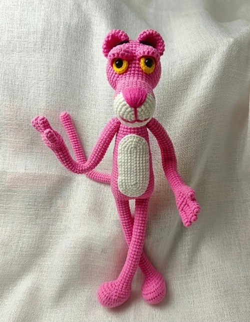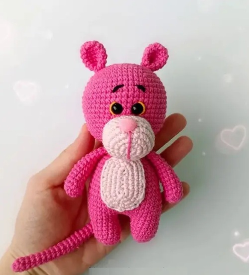 This design is by Olga. She crocheted this cute pink panther with ch, sc, dc, hdc, inc, dec, and sl st crochet stitches. Simple!