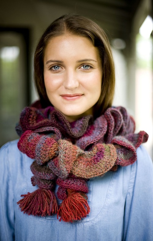 This tropical scarf, or you may call it a neck warmer, is made by working lengthwise and finished in just four rows. Its a great pattern for practicing the ruffled stitches.