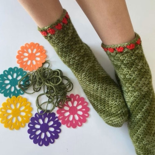 Take inspiration from this paid pattern by Julie aka ACCROchet to craft a pair of tulip designed socks. Its made from DK-weight yarn and a 3.75-4mm crochet hook.