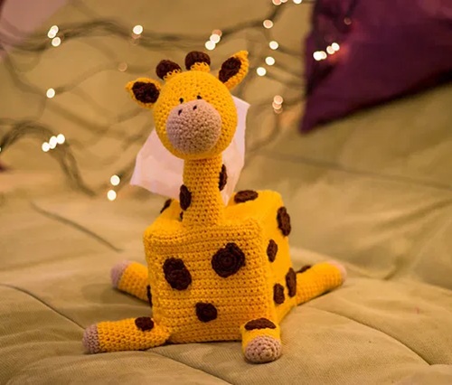 This giraffe tissue box cover by Niki Deli works up quickly because it uses intermediate level crochet stitches. It uses simple gauge and inexpensive supplies.