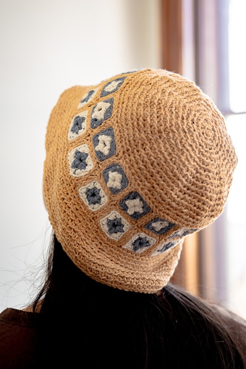 This granny square hat by Susan is named after the island town of Nantucket. It is crocheted with a mix of ch, dc, sc, and rep stitches only.