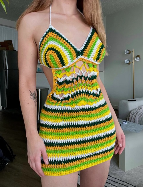 This garment from Heycarrie is backless with a cross lace design, a V-shaped bralette, and other interesting details. You can learn from the tutorial by following along and crocheting it.