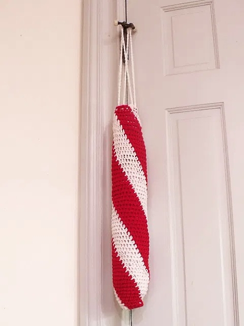 Lisa Meeuwen is the brilliant crocheter behind this spiral candy cane-themed plastic bag holder. Its a great place to store your plastic bags.