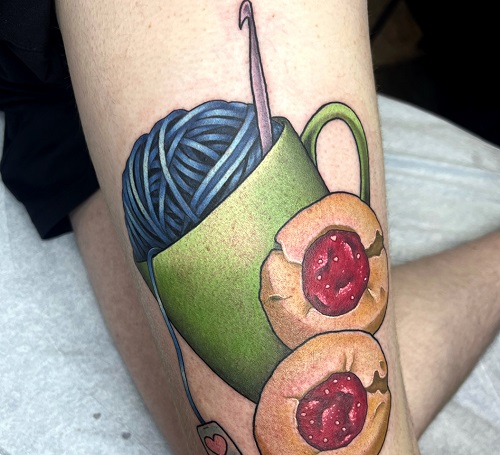Crochet with tea and cookies tattoos provides a cozy, comforting image that warms the heart. This design beautifully illustrates that crochet is often enjoyed in moments of relaxation, accompanied by a cup of tea and a plate of cookies.