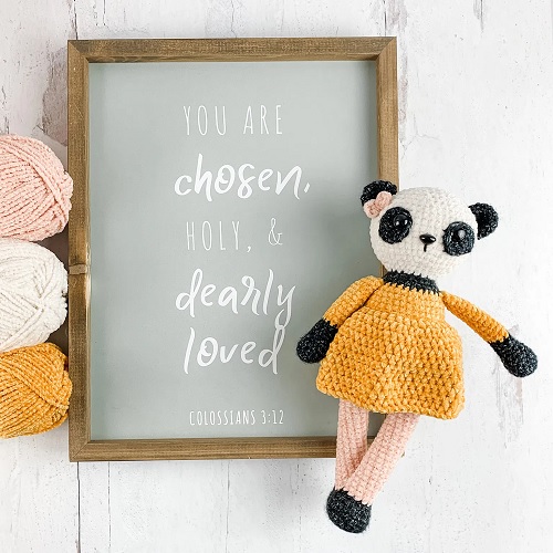 This little panda by Marina Chuchkalova is a simple toy wearing a cute dress. Check the gauge, material, stitches, and other things to get started.