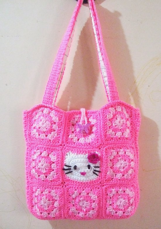 This Hello Kitty tote bag uses 17 basic granny squares, Hello Kitty square, and single crochet at the sides.