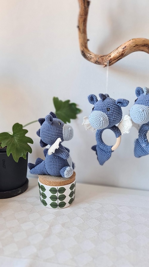 Lizette Bys Dragon rattle is eye-catching and looks good as home decor too, as shown. Read the instructions to crochet.