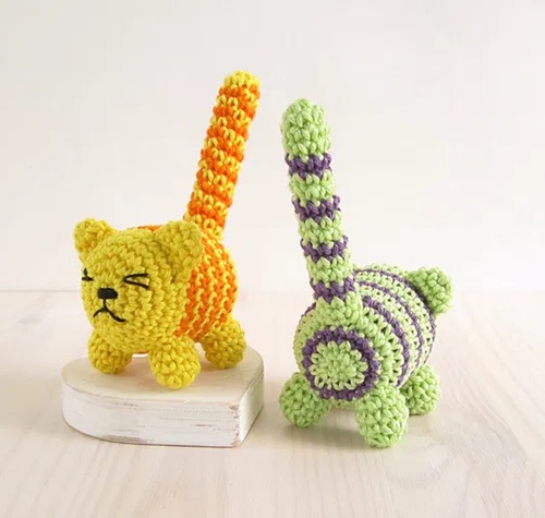 This small stripy cat rattle is crocheted in spirals using a Kinder plastic egg with basic stitches and easy to get supplies by Kristi. Do check.