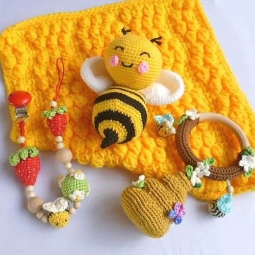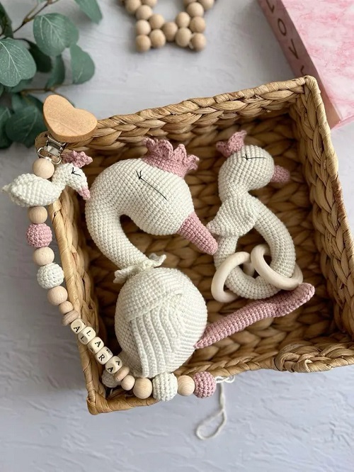 -themed set is a nice baby accessory to have with. It includes an amigurumi toy, a lovey, and a pacifier clip.