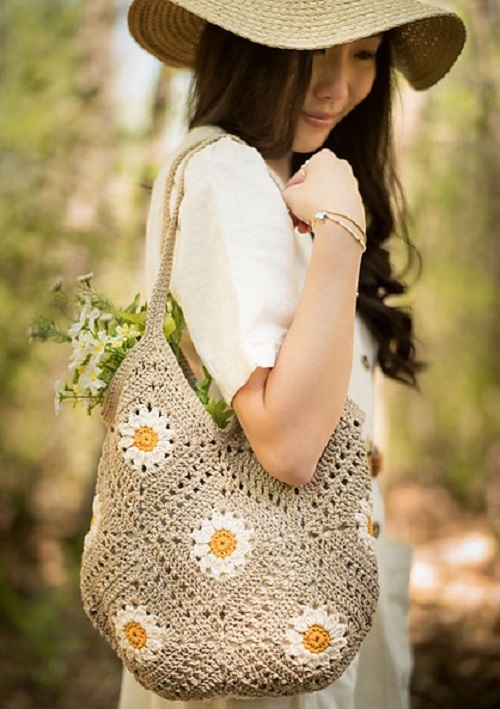 The beautiful daisy tote bag is crocheted with 13 granny squares.‚ Stephanie Jessica Lau makes this elegant, medium-sized bag quite spacious.