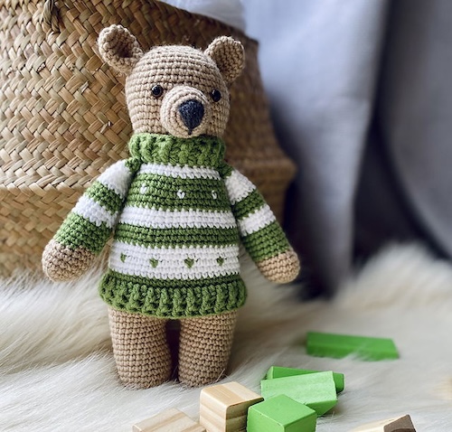 This adorable teddy bear toy is crocheted with love! You will need a 4 or 4.5 mm crochet hook and easy level crochet stitches knowledge to craft this one. Check out Nataliias instructions on Ravelry.
