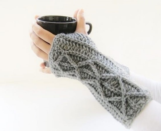This glove has a pale pink-hued yarn that is giving off feminine flare. Crochet this wrist-warmer using ss, dc, and ch stitches by taking a guide from‚ this DIY.