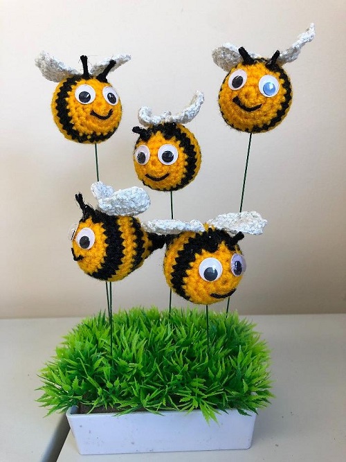 This would be a nice decorative item to place next to the window! Kate Axe made a bee gang with simple crochet stitches using yellow, white, and black wool.