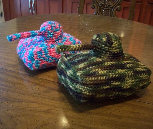 Haley Haleys-hooks crocheted tanks may look powerful, but they are so soft that if your children throw them at each other, they wont get hurt! Designed with basic colors using sc, st, ch, and sl st stitches!