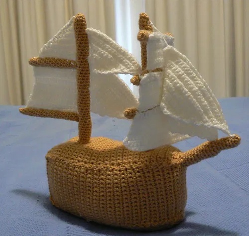 The tall ship is 30 cm long and features a keel, deck, hull, bowsprit, masts, yardarms, and sails. Crocheted in parts and assembled step by step. Know how to do that with Jazmo Tennants free tutorial.