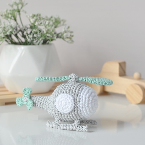 Elisas helicopter amigurumi toy is designed with white, gray, aqua yarn and beginner-level crochet techniques. Its simple to work with!