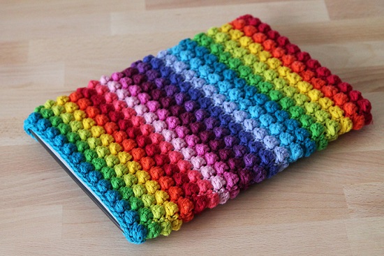 The bobble stitching engaged here imparts a stretchy texture to this sleeve, making sure that your tablet is safe. The crocheter has fused multiple colors in this sleeve using the chain, sc, ss, and bobble stitching.