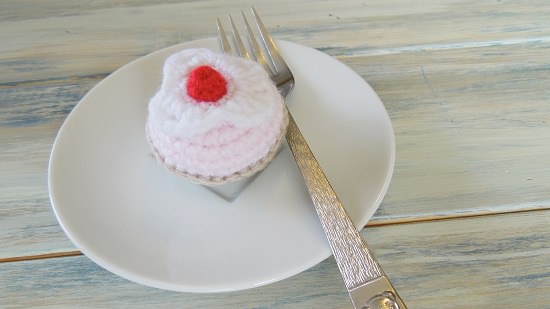 The addition of little cherry on top of this mini cup makes it visually stunning. For crocheting these mini-cupcakes, vlogger suggests using DK worsted weight yarn‚ on light pink, white, and cherry red colors.