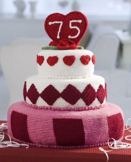 This crochet cake comprises three layers, and each one is individually worked in continuous rounds and then finally sewn together. You can also crochet diamonds, flowers, and hearts‚ for embellishment.