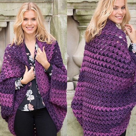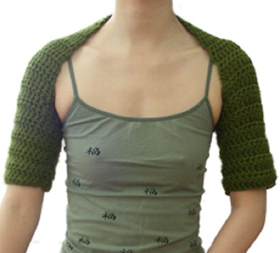 This crochet pattern, in the bold green shade, is a blend of simple yet sassy looks. This beginner-friendly shrug calls for a crocheted rectangle, whose ends have to be sewn up for making the sleeves.