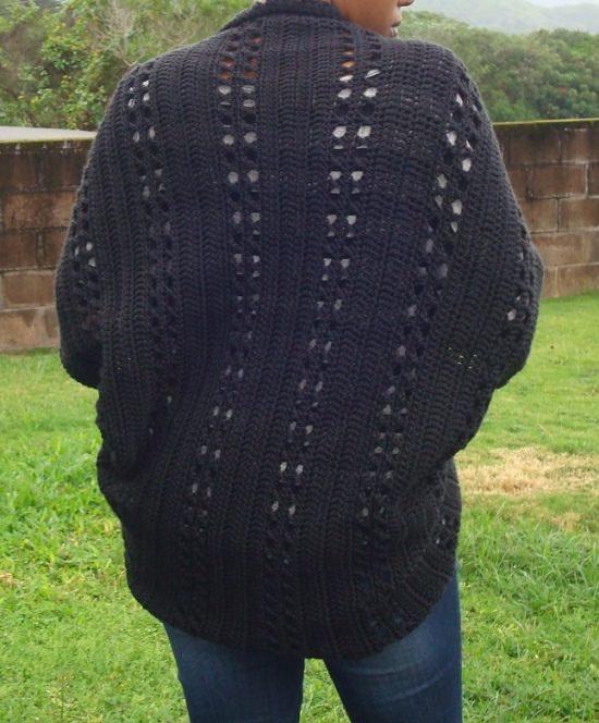 The fabulous triangle stitch used for crocheting this red beauty carves a wonderful lacy texture on it.‚ This cardigan is made from one piece of the rectangle, using two skeins of acrylic yarn.