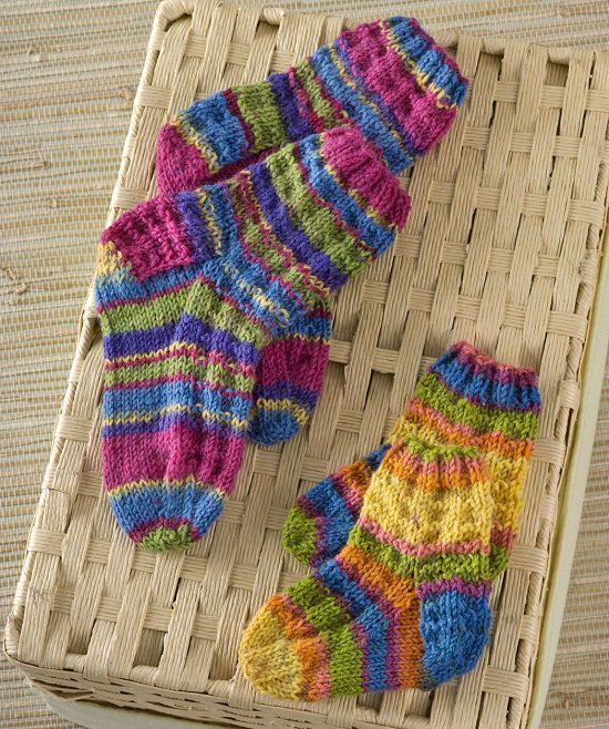These toddler-sized, chic pair of socks, can be a heart-warming gift for any expecting mother. Its pattern is worked in rounds and uses DK weight yarn in two warm tones.