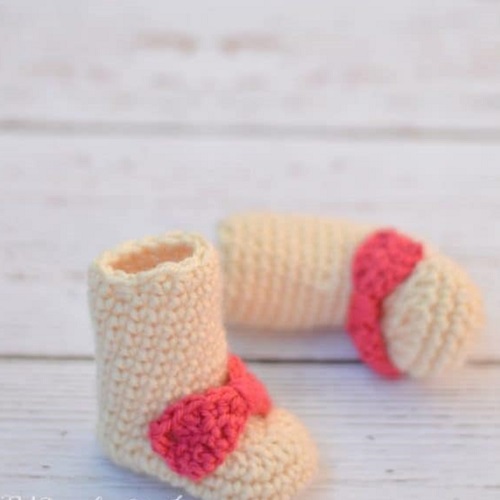 These elegant booties, accentuated with a bow, is prepared using worsted weight yarn and best fit for 0-6 months old toddler.