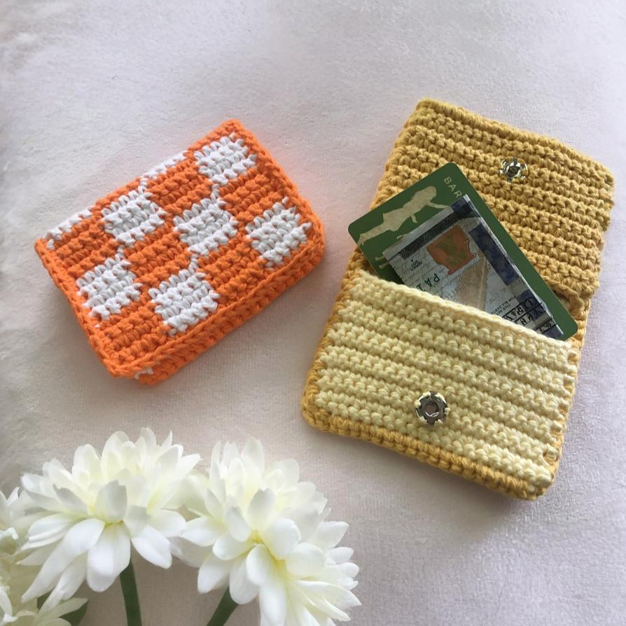 Elizabeth Goddards checkered card holder will make you work with advanced beginner stitches and color-changing techniques. It is a functional item to hold your bills, money, and more!