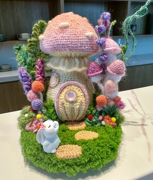 This whimsical fairy garden pattern is shared by Nixia Alejandra Quero Tangol. In this, you have to crochet the base, house, flower, and leaves using various yarns and other materials. Check them all!