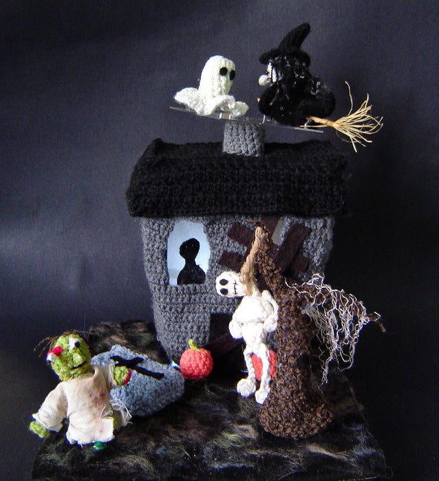 Christine Nast designed a haunted house with scary characters, including a ghost, a witch, a zombie, and a skeleton. The spooky tree, pumpkins, and that ominous figure at the window are calling you! Ha! To crochet the pattern!