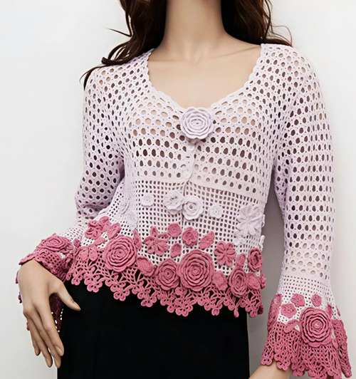 9. Crochet Cardigan With Flowers On The Bell Sleeves